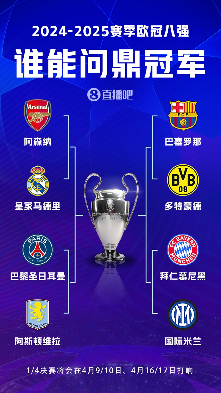 03月13日讯 欧冠1/8决赛次回合比赛全部结束。上半区的4强分别是阿森纳、皇马、巴黎和维拉,下半区则是巴萨、多特、拜仁和国米。